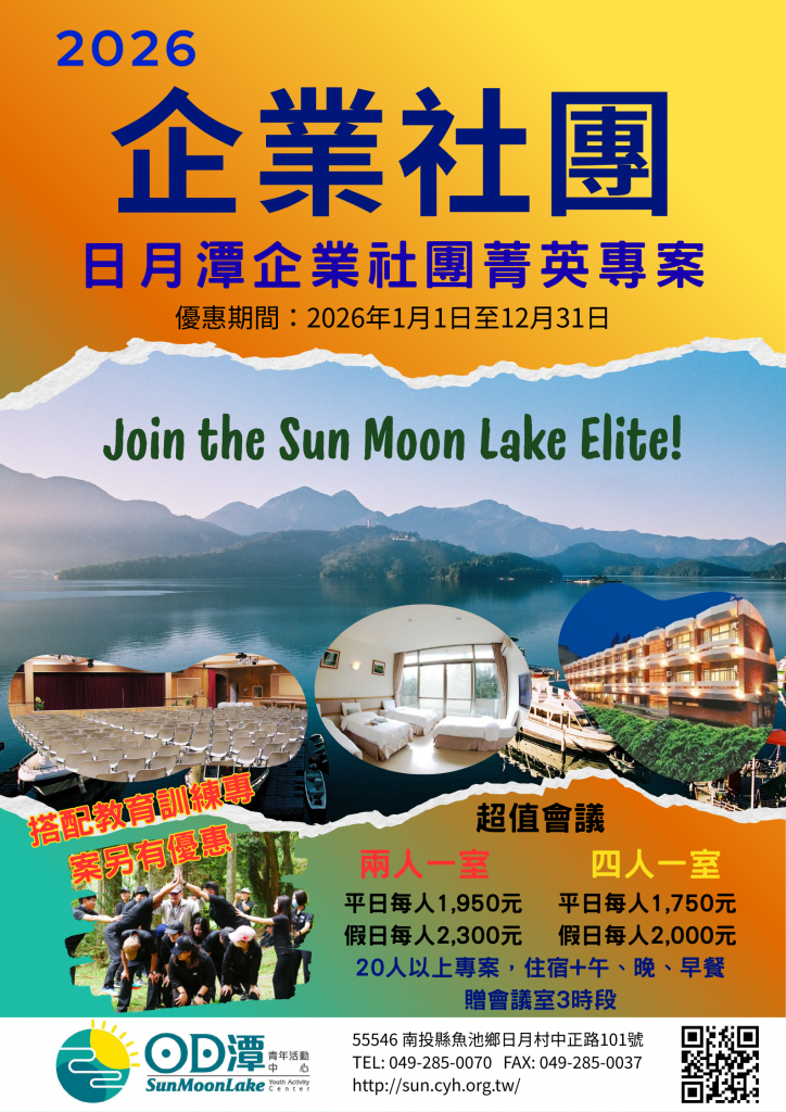 企業會議專案 1:兩人一室會議方案: 平日每人1,950元,周六及連續假日每人2,300元 2:四人一室會議方案: 平日每人1,750元,周六及連續假日每人2,000元 住宿:住宿房型由本中心安排,恕 […]